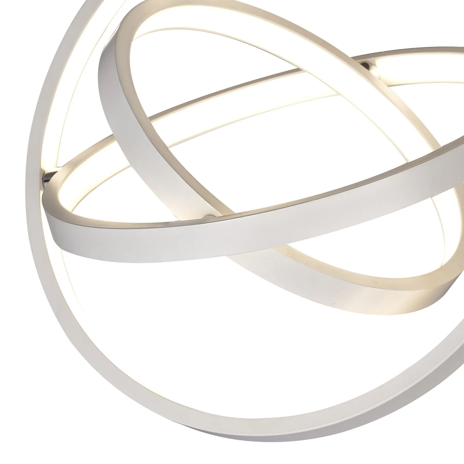 Встроенные светодиоды размещены в акриловом диффузоре внутри каждого кольца, образуя световые обручи и придавая образ космичности и инновации. Регулируемые подвесные светильники доступны в трех размерах. коллекция также предлагает фиксированный потолочный светильник и настольную лампу.
